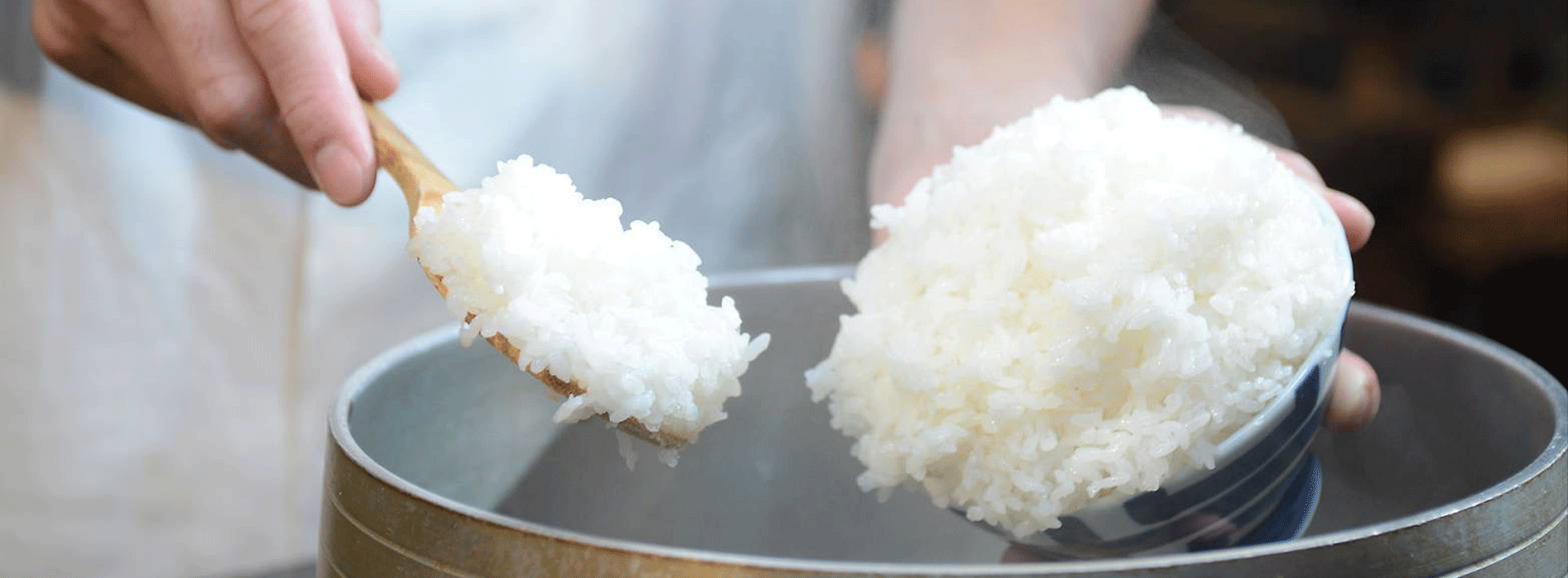 炊きたての銀色にキラキラ輝いているご飯…