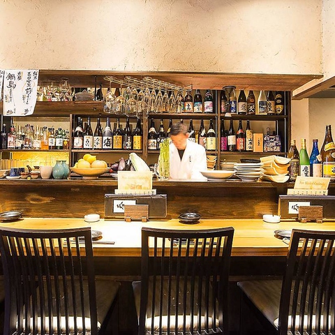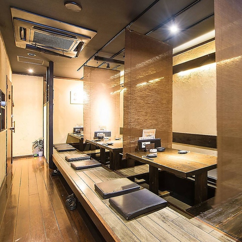 当店は、陳列されているお酒を眺めながら、さらには大将と会話を楽しめるカウンター席、肩ひじはらず、ワイワイと活気のある空間で楽しめるテーブル席、そして暖簾で半個室になるプライベートなひとときを過ごせるお座敷席をご用意しております。