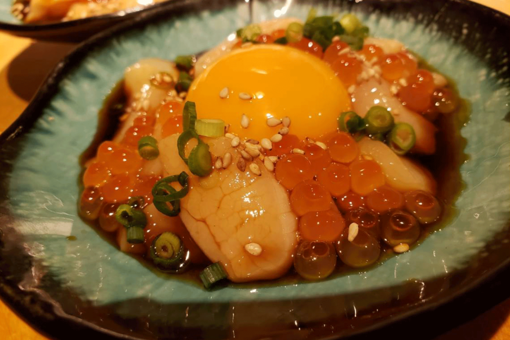 生食用の新鮮なホタテ貝柱と北海道産イクラの醤油漬けをとろ~り卵黄に絡めた見た目にも贅沢な逸品に仕上げています。